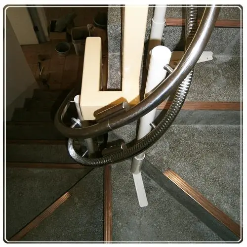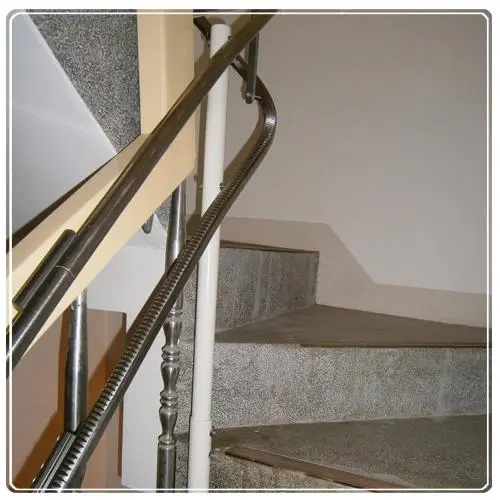 - 因為突然高起的幾階 我們爬梯機器的軌道在米字梯的位置時就比須拉高處理 這時腳離地面也會比較遠 為了不讓家人乘坐時有驚嚇之感 全包式扶手這時就帶給家人滿滿的安心感